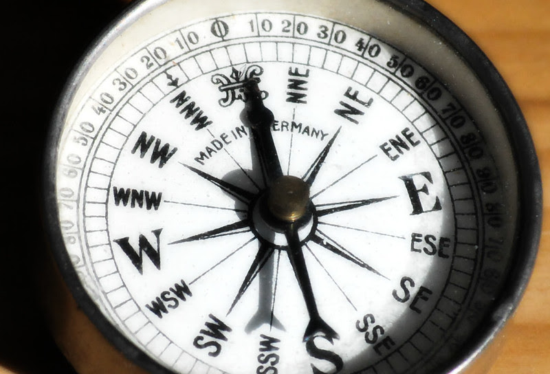 My old compass still shows the way to magnetic north. This 16-point compass displays the four main cardinal points plus the 12 half wind directions. The traditional north symbol, a fleur-de-lis has been stylized from its French origins to something else from Germany. Looks to be pre-WWII. Now you will never be lost.